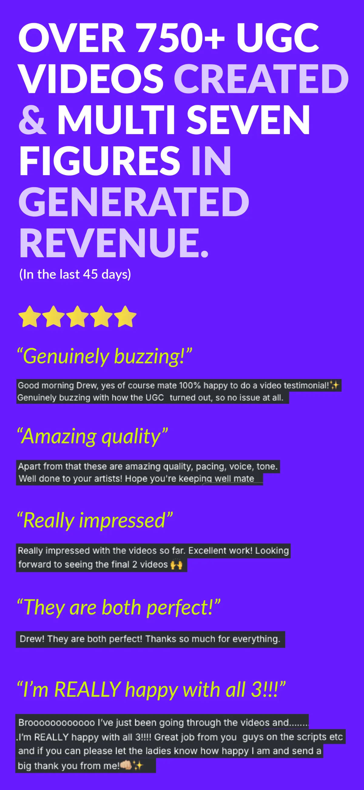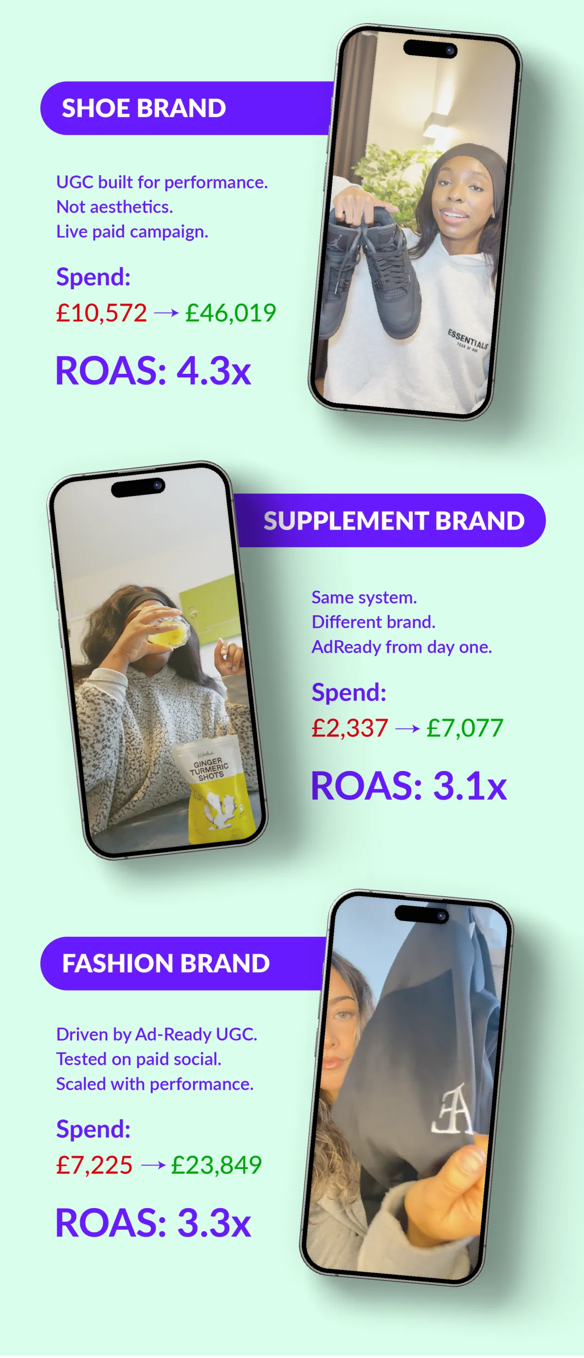 We build UGC for one purpose: performance. We’ve delivered 1000+ UGC videos and tested millions in ad spend. Trusted by brands across beauty, fashion, wellness and more.